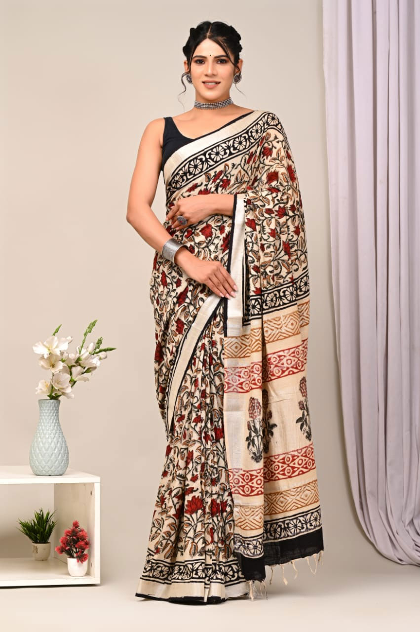 Hand Block Printed Antique White Linen Saree with Blouse