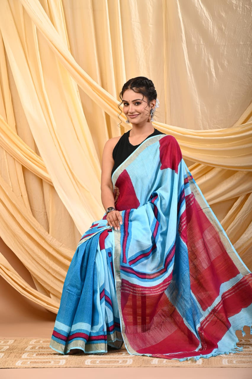 Hand Block Printed Blizzard Blue Linen Saree with Blouse
